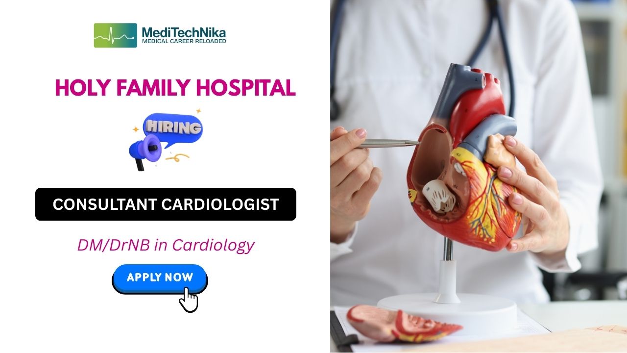 Cardiologist Jobs: Holy Family Hospital, New Delhi, is inviting applications for the position of Consultant Cardiologist to join its highly reputed medical team. This role offers an opportunity to provide advanced cardiovascular care within one of Delhi’s most trusted and compassionate healthcare institutions. Candidates with strong clinical expertise, interventional cardiology experience, and a commitment to patient-centered care are encouraged to apply.