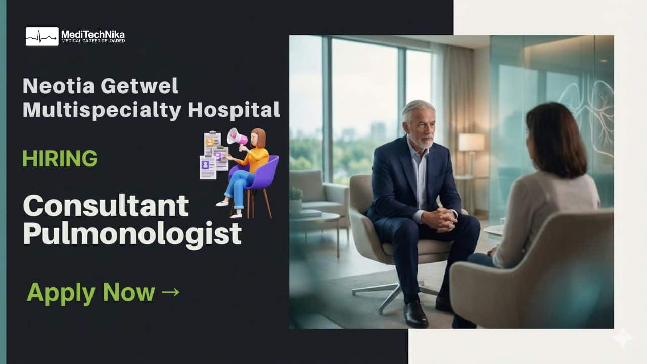 Medical Job: Neotia Getwel Multispecialty Hospital is inviting applications from highly qualified and experienced medical professionals for the position of Consultant Pulmonologist. This is an excellent opportunity for specialists looking to build a long-term clinical career in a reputed multispecialty hospital known for advanced medical care and patient-centric values.