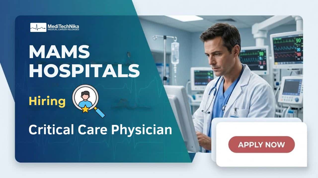 Physician Job: MAMS Hospitals, Hyderabad, is inviting applications from skilled and dedicated critical care physicians to join its advanced critical care team. This role offers an excellent opportunity to work in a high-acuity hospital environment with state-of-the-art infrastructure while delivering life-saving care to critically ill patients.